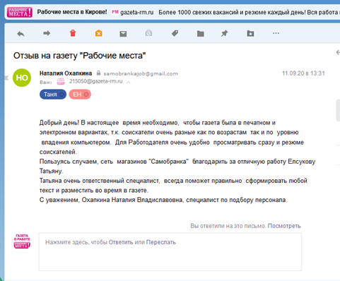 Благодаря газете «Рабочие места» мы сформировали профессиональную команду сотрудников. Необходимо особо отметить чуткое отношение менеджеров к каждому клиенту, оперативное реагирование на наши изменения.